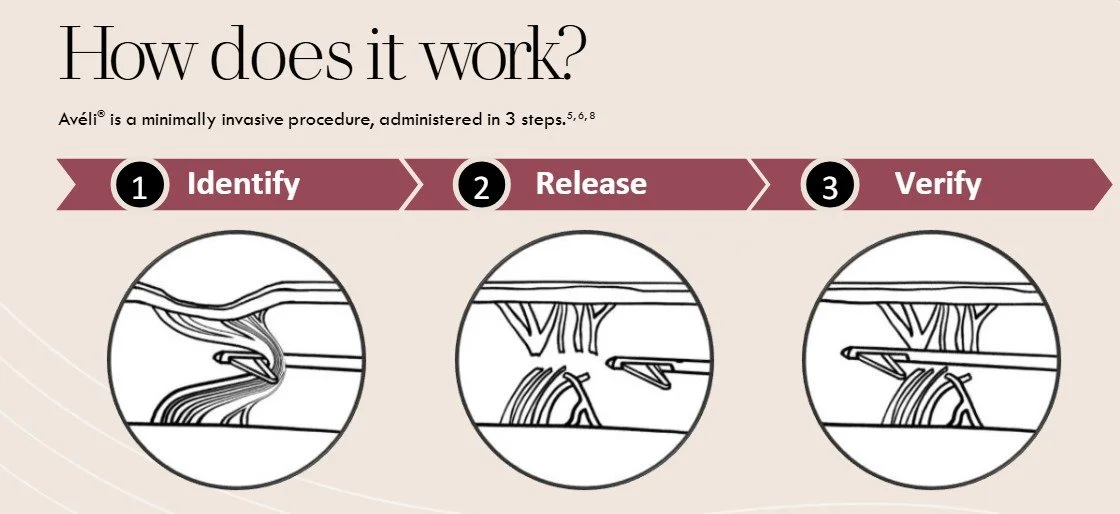 Aveli works by permanently removing these connective bands, releasing the skin from the underlying muscle and allowing it to lie even with the skin around it.