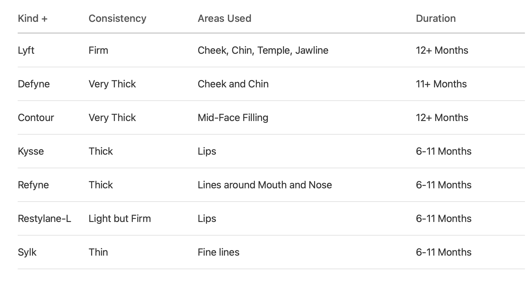 Below is a chart showing a good example of how one brand, RESTYLANE, has different properties (called rheology) and where each kind is typically used.